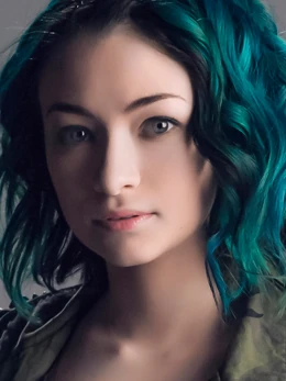 Das is average height with shoulder-length blue and green wavy hair. She has light blue eyes and a pale complexion. Das wears colorful clothing including a grey jacket with pink and purple sleeves and multicolored patterned pants. She usually has a long-sleeved plaid shirt wrapped around her waist.